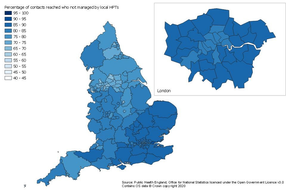 If NHS Test and Trace is not able to reach an individual testing positive or if no communication details are available, then it is not always possible to know if the case should be managed by a local HPT or not. Therefore, these breakdowns are not available. ↩