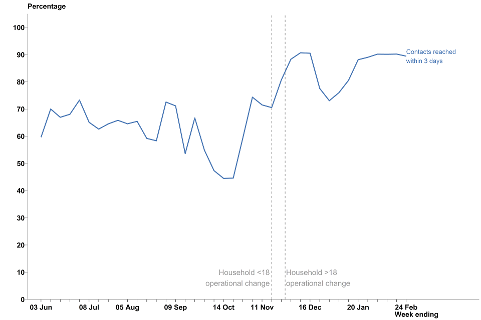 Between 18 February and 24 February 2021, 103,404 (89.4%) contacts that were reached and told to self-isolate were reached within 3 days of the case that reported them taking a test which subsequently returned a positive result. This is with a slight decrease from 90.2% in the previous week.
