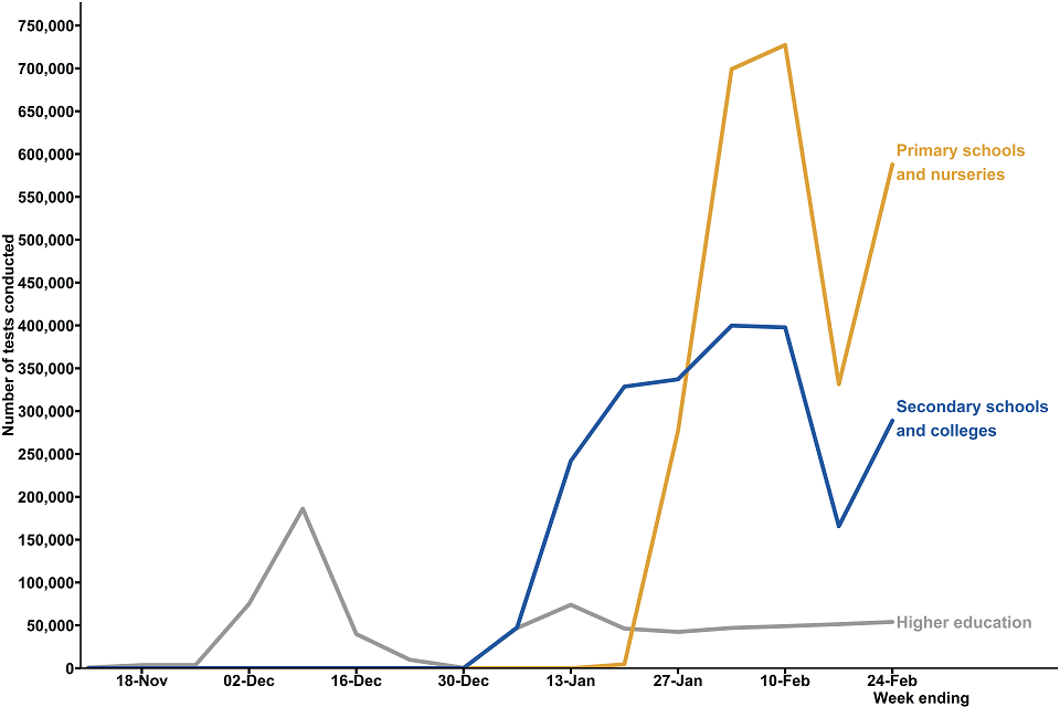 The number of LFD tests conducted within primary schools, school-based nurseries and maintained nursery schools increased substantially between 14 January 2021 and the beginning of February to over 700,000 tests in a week. Between 11 and 17 February the number of tests conducted decreased compared to the previous week, which coincided with half term. In the latest week the number of tests conducted has begun to increase again to 587,943 tests although this is still impacted by half term. 701 positive test results were returned in the latest week within primary schools and nurseries, a decrease from 750 positive results in the previous week.