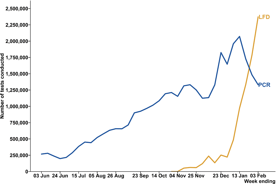 The number of LFD tests conducted has been increasing overall since their introduction in October 2020. In the latest week (28 January to 3 February), 2,372,358 LFD tests were conducted, which is over 17 times higher than mid-December.