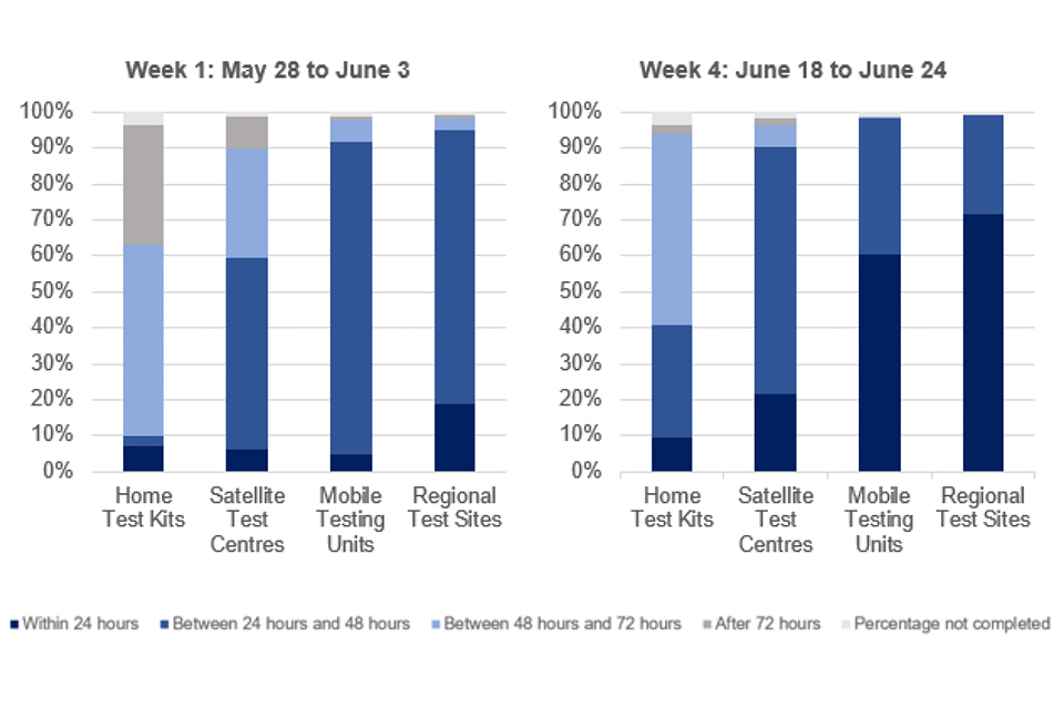In comparison to week 1 of Test and Trace, in week 4 a larger proportion of tests results were received within 24 hours of a test being taken, for all methods of testing. The largest improvements (decrease in time taken) were for regional testing sites and mobile testing units.