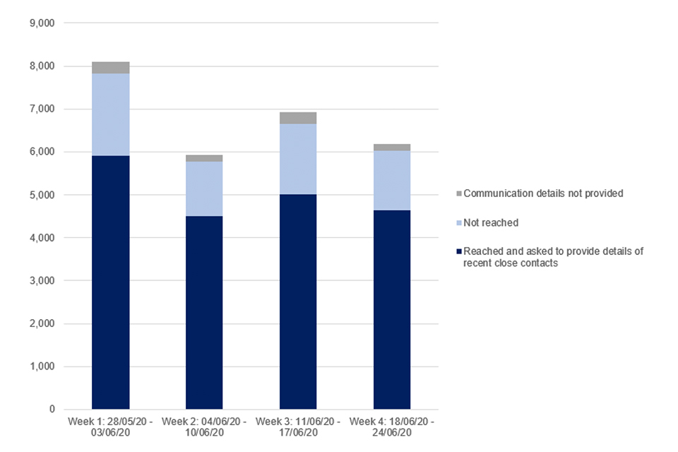Between 18 June and 24 June around 3 in every 4 people transferred to the contact tracing system were reached and asked to provide information about their contacts