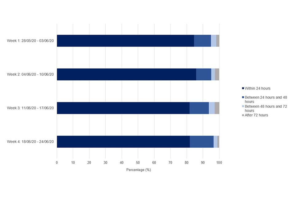 In the week 18 June to 24 June, 40.6% of test results were received within 48 hours of the test being taken. If we consider the day the test was taken, this means that 25.6% of tests results were received the next day after the test was taken.