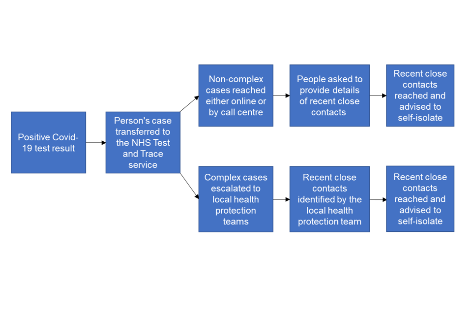 The diagram shows the journey a person can take through the NHS Test and Trace service. This starts with a positive COVID-19 test result. A person’s case is then transferred to the NHS Test and Trace service and can be managed in one of two ways. First, non-complex cases are reached either online or by a call centre. They’re then asked to provide details of recent close contacts. These recent close contacts are then reached by the NHS Test and Trace service and advised to self-isolate. Second, complex cases are escalated to local health protection teams who work to identify and reach recent close contacts and advise them to self-isolate.