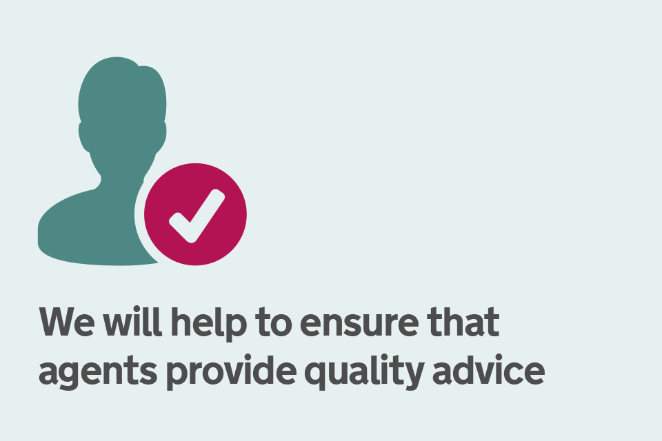This graphic shows a head with a tick and the caption: we will help to ensure agents provide quality advice.