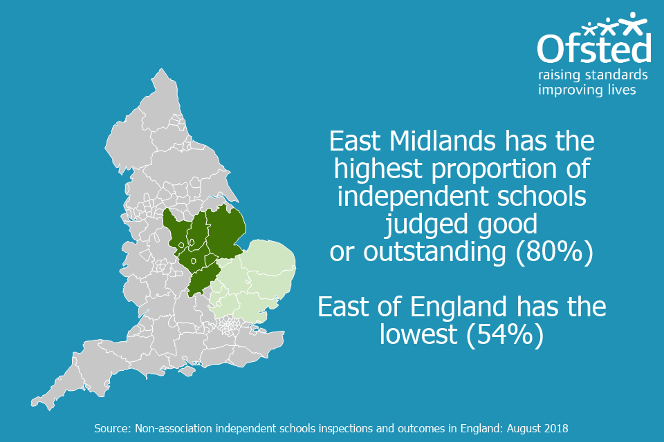 Infographic stating, 'East Mindlands has the highest proportion of independent schools judged good or outstanding (80%). East of England has the lowest (54%)'.