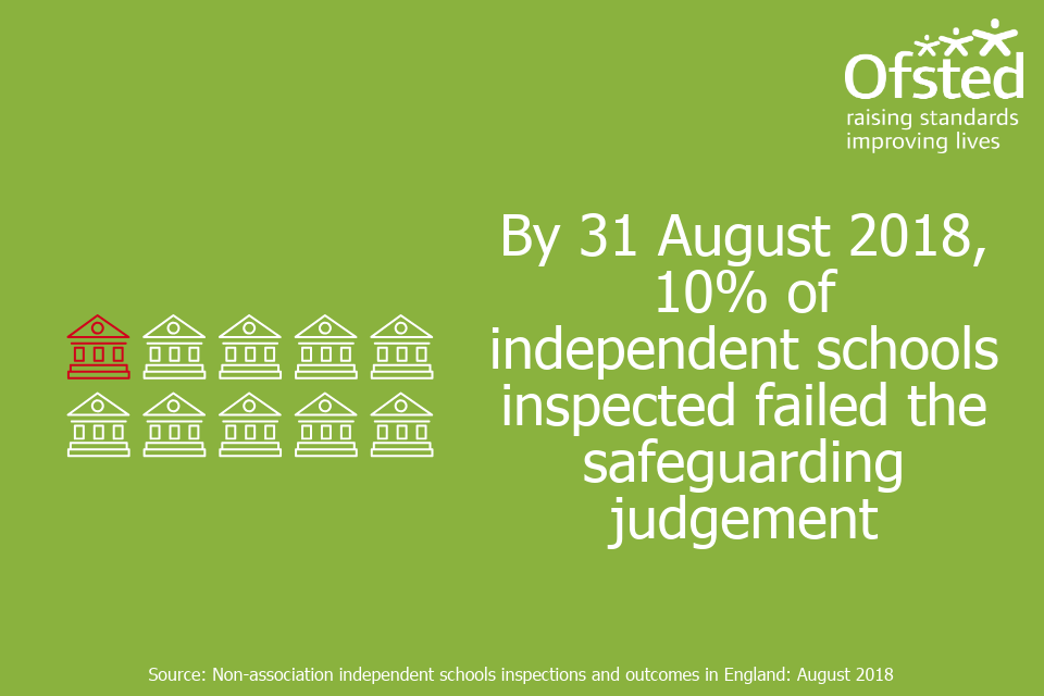 Infographic stating 'By 31 August 2018, 10% of independent schools inspected failed the safeguarding judgement'.