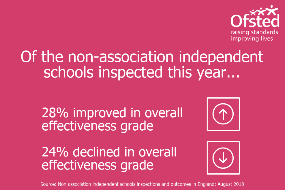 Infographic stating 'Of the non-association independent schools inspected this year, 28% improved in overall effectiveness grade and 24% declined'.