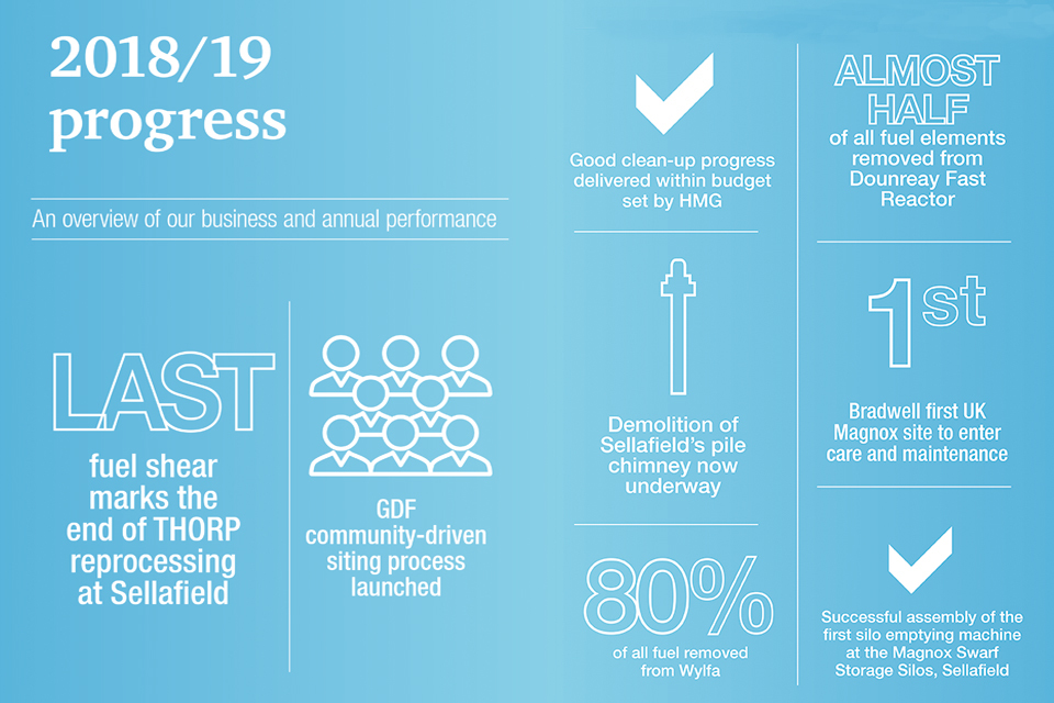 Our sites made steady progress during 2018/19 in our long-term clean-up mission. Magnox placed its first site into formal care and maintenance, with the approval of the Office for Nuclear Regulation. Sellafield ended fuel reprocessing operations, as planned, at one of its two reprocessing facilities. Our subsidiary Radioactive Waste Management Ltd launched the consultation and dialogue process to identify a volunteer host community for a Geological Disposal Facility.