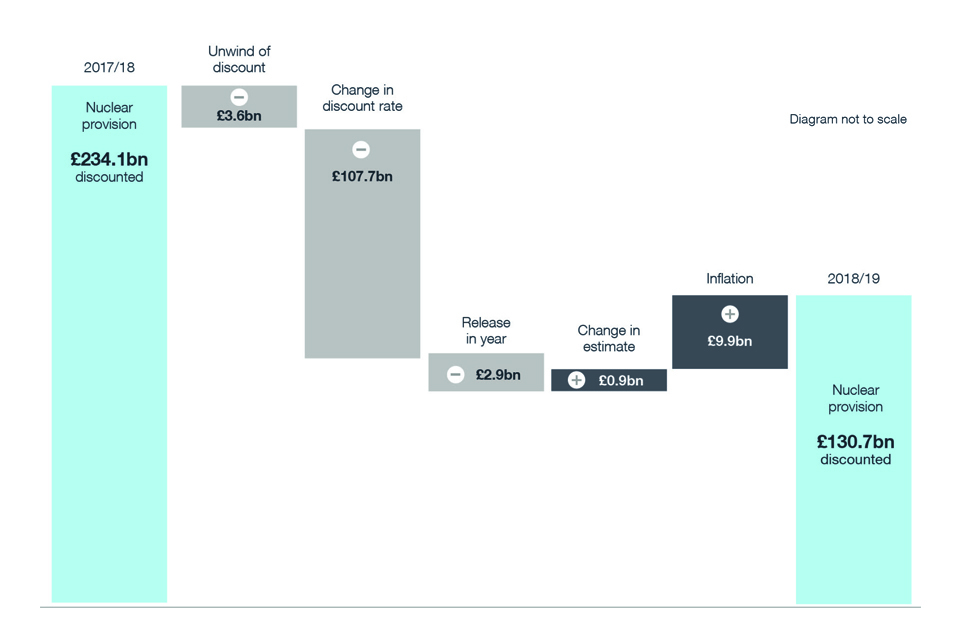 A change in the basis for calculating discount rates (including revised inflation assumptions) by HM Treasury has driven a £104 billion decrease in the discounted nuclear provision. The underlying undiscounted provision has increased in the year by £3 billion principally due to inflation. Details behind the key numbers are shown in the financial statements.