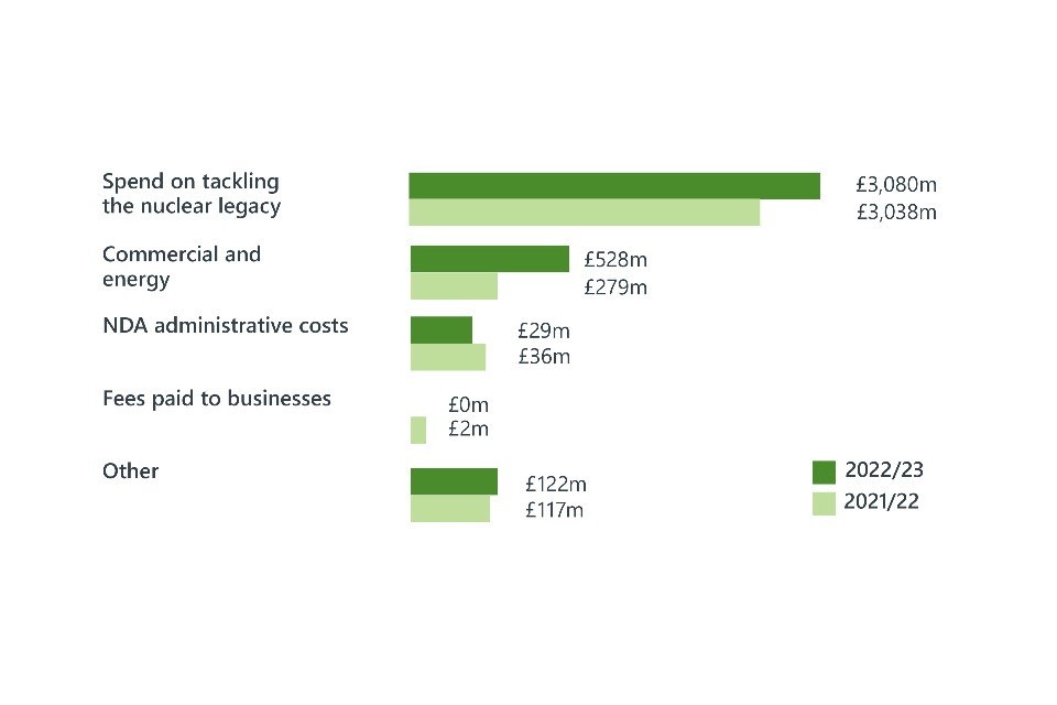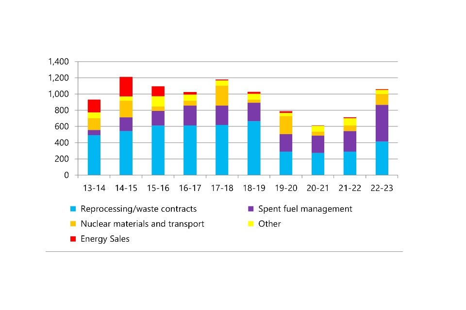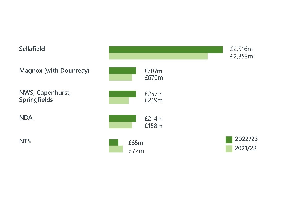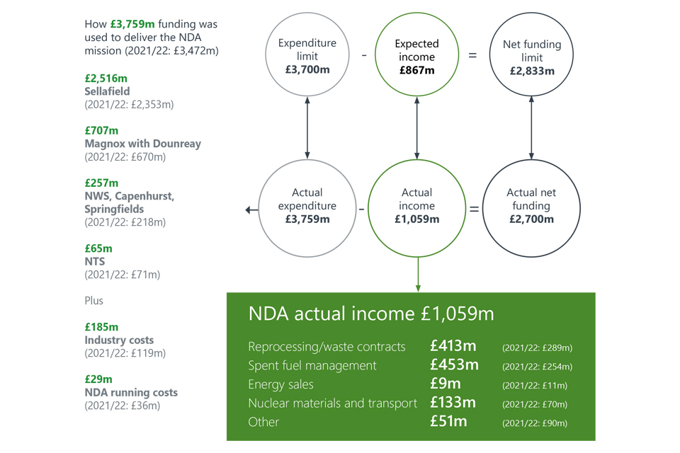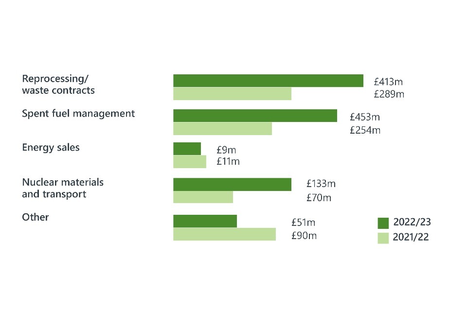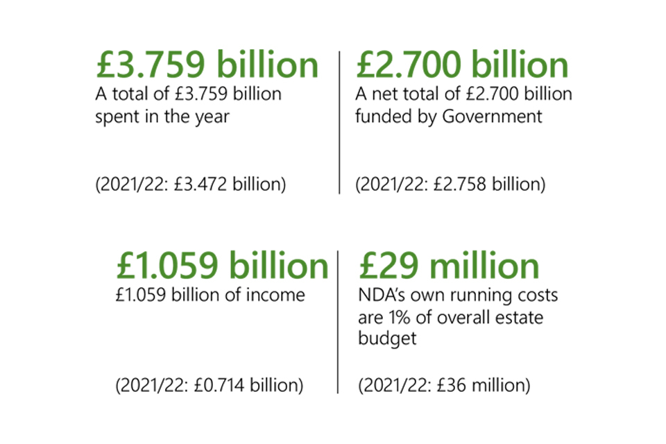 Despite these challenges, financial risks and opportunities were managed effectively on a portfolio basis, ensuring that the Group remained within the overall funding settlement agreed with UK Government through the Supplementary Estimate process. With the support of the Group Leadership Team and working closely with UK Government, we were able to take risk-based prioritised investment decisions and maximise commercial revenues. Commercial revenues increased by 48% to £1,059 million (2021/22: £714 million) with higher levels of fuel deliveries from the UK’s operational nuclear power stations and the successful conclusion of a package of contracts for the management of wastes from overseas utilities. The high levels of inflation impacted expenditure budgets but also delivered a beneficial impact in the accounting for our long-term contract income.