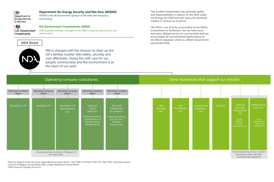 Other NDA group companies include NDA Archives Ltd, NDA Properties Ltd, Rutherford Indemnity Ltd and Energus. An organisational structure for the NDA group is shown on page 22 and reflects the group structure during the year.