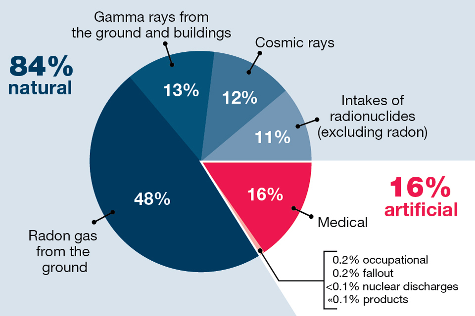 In the UK, 84% of the 2.7 mSv average annual radiation exposure of a person comes from natural sources, made up of 48% radon gas from the ground, 13% gamma rays from the ground and buildings, 12% cosmic rays, and 11% intakes of radionuclides exluding radon. The remaining 16% comes from artificial sources, including medical radiation, with <1 % from occupational exposures, fallout, nuclear discharges and products.