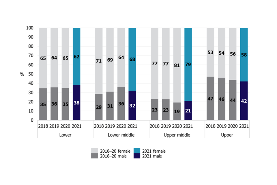 Although there are more women than men in many grades, there continue to be more women in junior grades overall. There is a more even gender balance in the upper pay quartiles, with a 50:50 gender split for both Senior Civil Service (SCS) 1 and 2 pay bands.