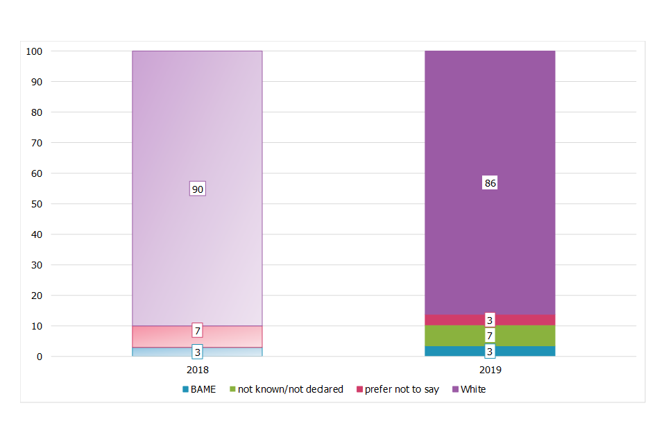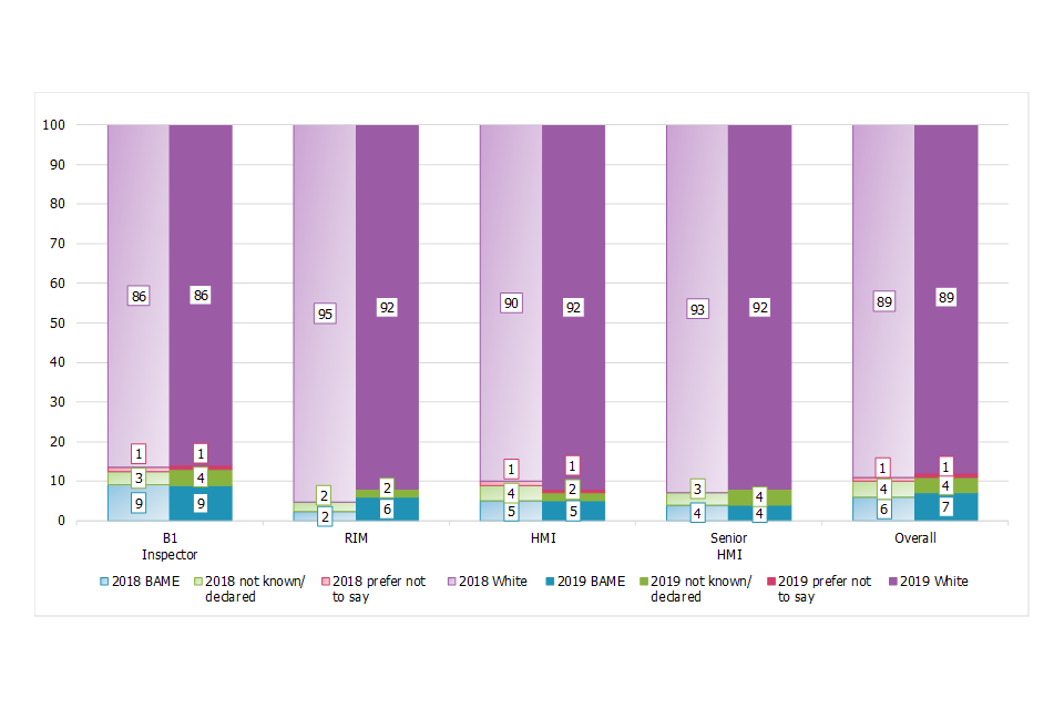 For example, although the percentage of black and minority ethnic (BAME) staff in Ofsted overall is higher than the Civil Service average, the figures for our inspector grades continue to be lower. This reflects the limited diversity in leadership positions in the sectors from which we recruit. To help tackle this, we have continued an inspection shadowing programme for BAME middle leaders who aspire to become Her Majesty’s Inspectors (HMI). This year, we have introduced similar initiatives to attract more contracted Ofsted Inspectors (OIs) from diverse backgrounds.