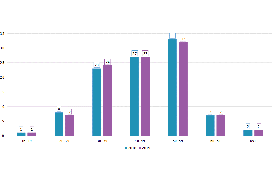 | Grade | 16–19 | 20–29 | 30–39 | 40–49 | 50–59 | 60–64 | 65+ | Not known/ not declared | Total number of employees |