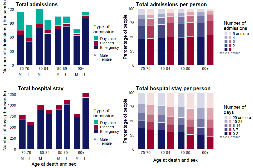 This report explores the relationship between hospital admissions and age, sex, cause of death in people aged 75 years and older, who comprise the majority (~69%) of all people who die. The hospital admissions considered include emergency admissions, planned admissions and day cases. It describes: