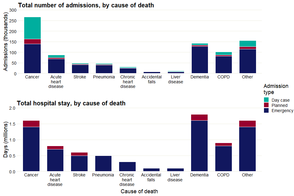 Cancer (38.8%) and liver disease (28.8%) showed the highest proportion of day case admissions. For the other cause of death groups this proportion was between 5.8% and 18.8%. There was a substantial number of admissions for people who had an underlying or contributory cause of death of dementia (141,833 admissions) or chronic obstructive pulmonary disease (COPD) (101,222 admissions).
