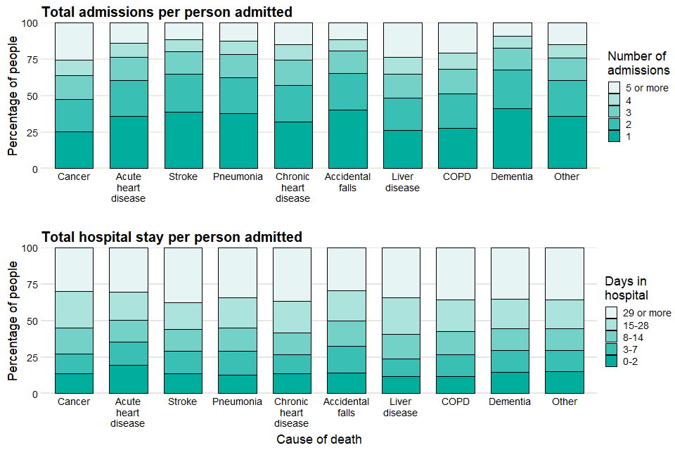 There is subtle variation between cause of death groups in the distribution of the total time each person stays in hospital (calculated as days in hospital per person with at least one hospital admission, Figure 4 (lower panel)). The proportion of people who were in hospital for 2 days or fewer is highest for acute heart disease (19.4%) and lowest for COPD and liver disease (both 11.9%). The cause of death groups with the highest proportion of total stays of 29 days or longer is stroke (37.7%) and chronic heart disease (36.8%), those with the lowest proportion were accidental falls (29.4%) and cancer (29.7%).