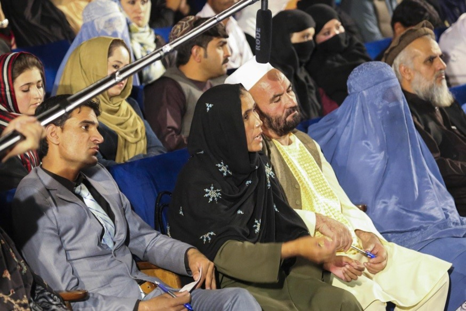 Image 1: Woman asking a question on BBC Media Action’s Open Jirga - a debate show broadcast in Afghanistan. Photo credit: BBC Media Action