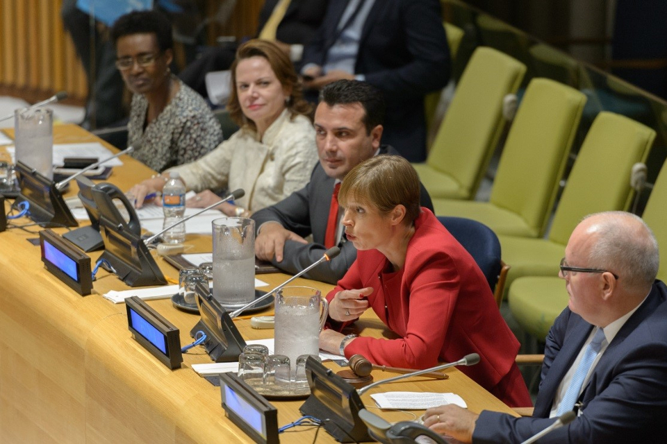 Image 3: President of Estonia Kersti Kaljulaid discusses how open government can renew democracy and rebuild citizen trust alongside other high-level leaders during an Open Government Partnership (OGP) event at the 72nd United Nations General Assembly; Photo Credit: OGP, Kal Dolgin