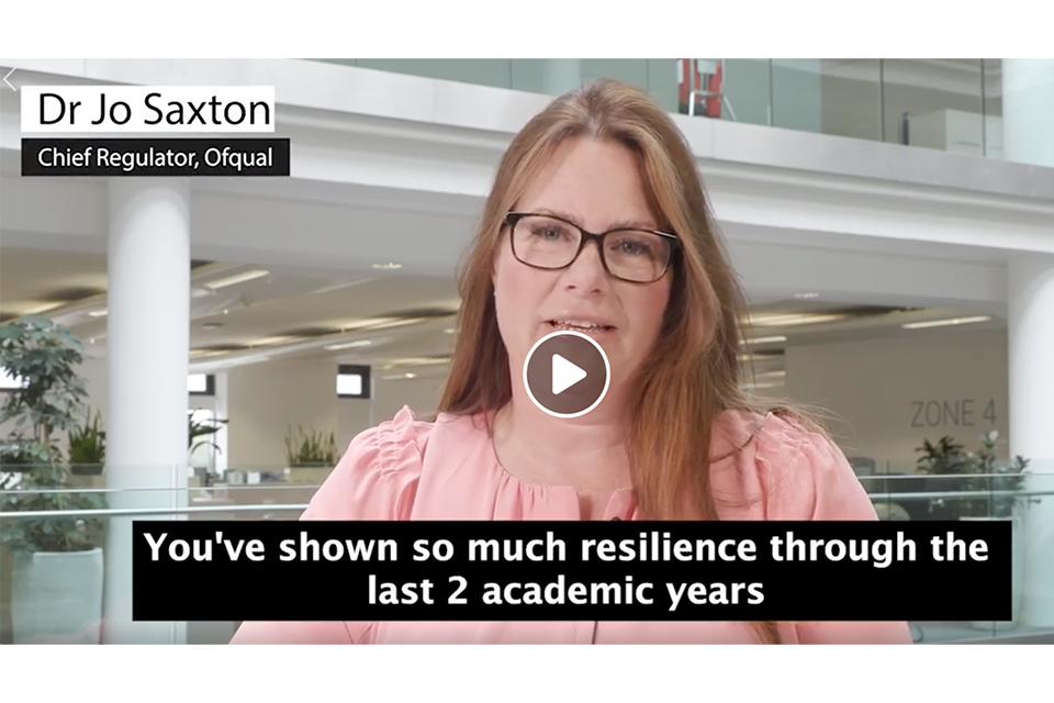 Image screen grab of a video showing Chief Regulator Jo Saxton with subtitles showing the words: "You've shown so much resilience through the last 2 academic years"