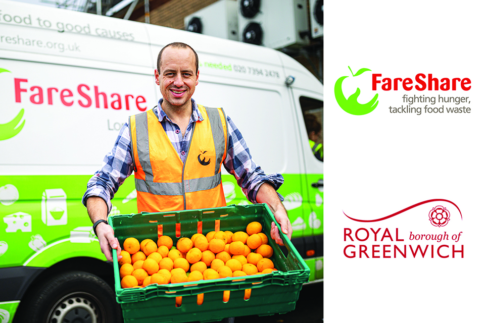 FareShare and the Royal Borough of Greenwich logos. FareShare food delivery representative.