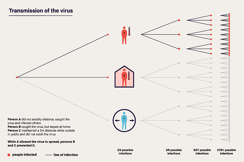 Figure 2: Transmission of the virus - Schematic diagram of the transmission of the virus with an R value of 3, and the impact of social distancing.