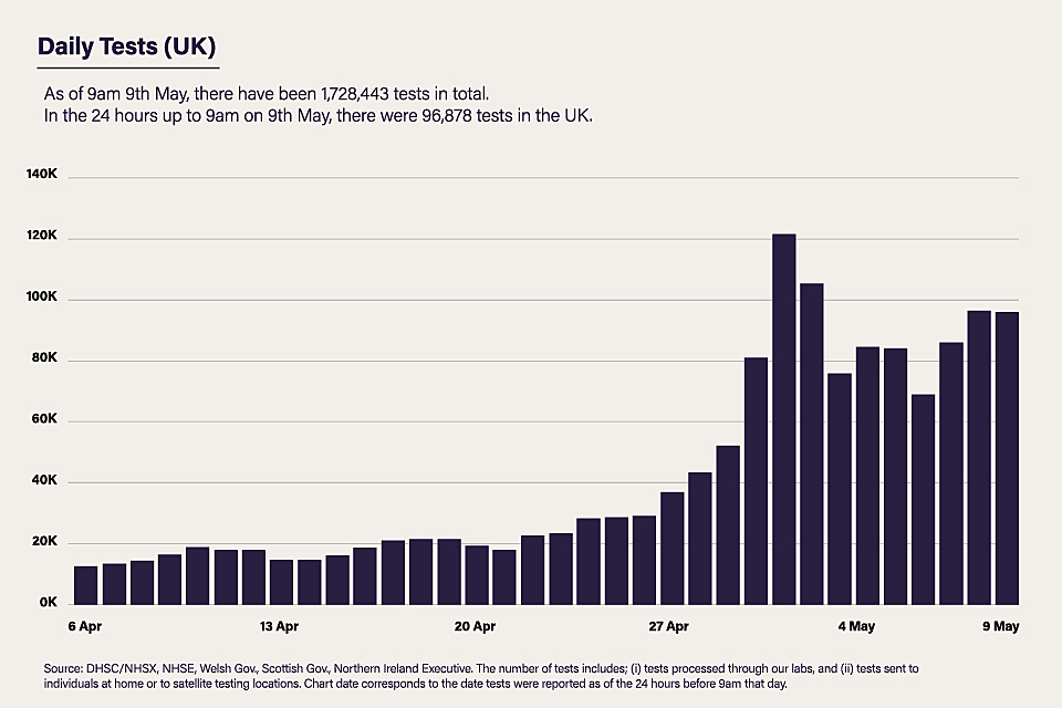 Figure 3: Daily tests (UK) The number of tests carried out in the UK as of 9am on 9 May