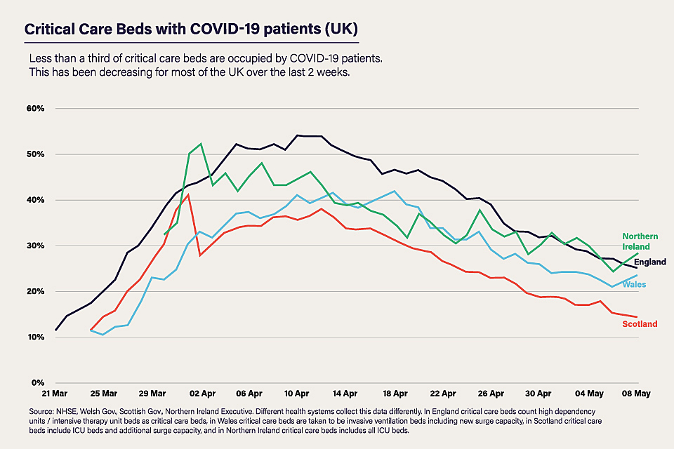 Figure 4: Critical care beds with COVID-19 patients (UK) - The percentage of critical care beds with COVID-19 patients up to 8 May.