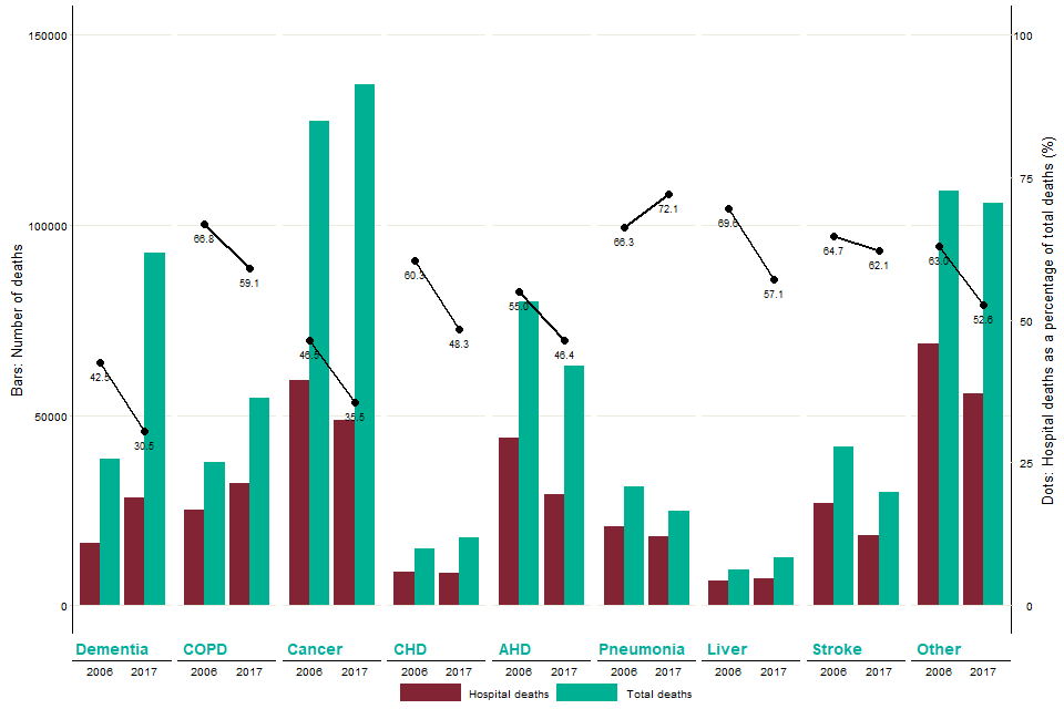 - for each cause of death group, with the exception of COPD and dementia, the number of deaths in hospital fell between 2006 and 2017