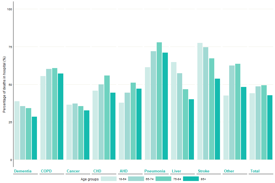 Figure 3: Proportion of deaths in hospital for each age group and cause of death category, 2017