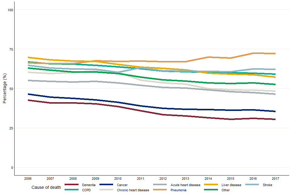 The proportion of people dying in hospital has decreased for all causes of death since 2006, with the exception of pneumonia.