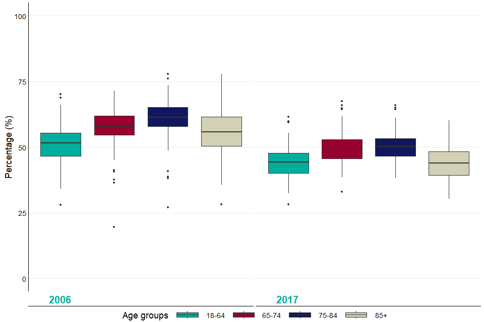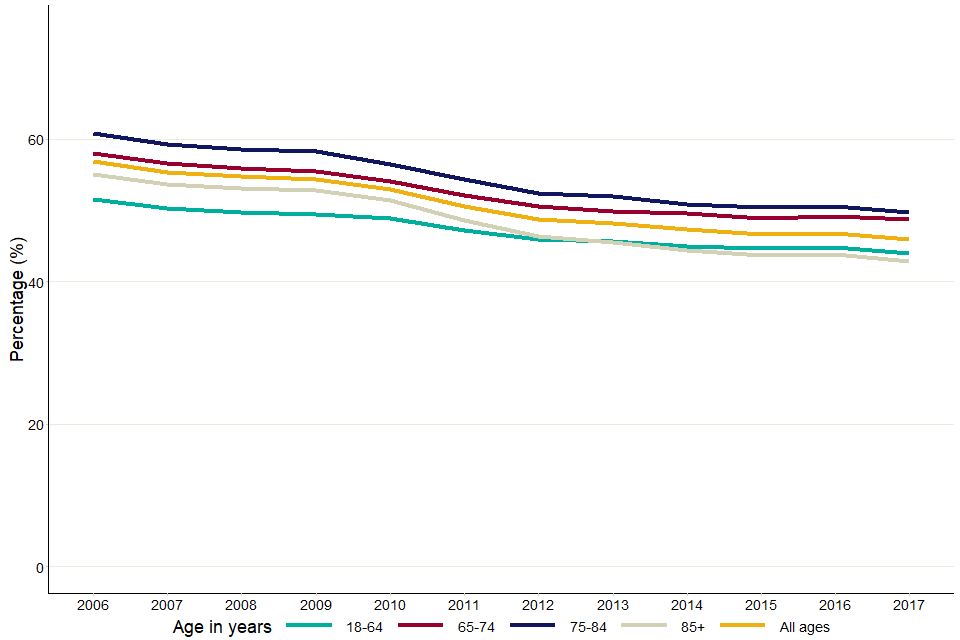 Table 1 displays a number of differences between 2006 and 2017 across age groups. The oldest age group (85 years or older) included the highest proportion of females (66.5% in 2006 and 61.5% in 2017). The younger adult age group (18 to 64) included the highest proportion of people from the most deprived communities (defined using the index of multiple deprivation deciles).