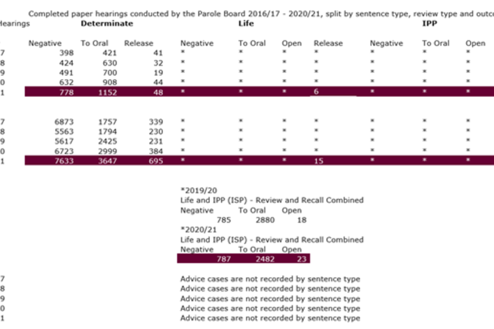1. Completed paper hearings conducted by the Parole Board from 2016/17 – 2020/21, split by sentence type, review type and outcome