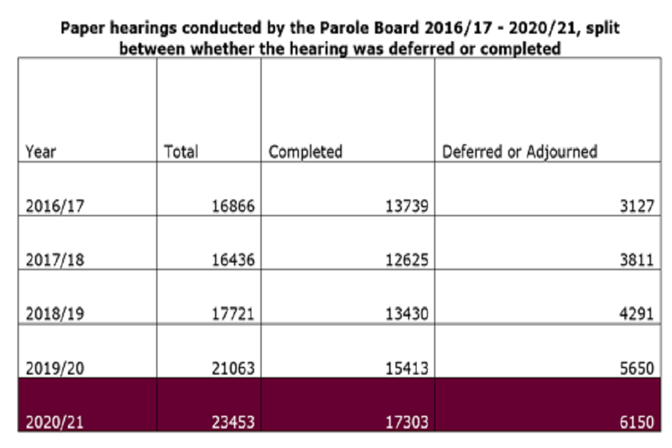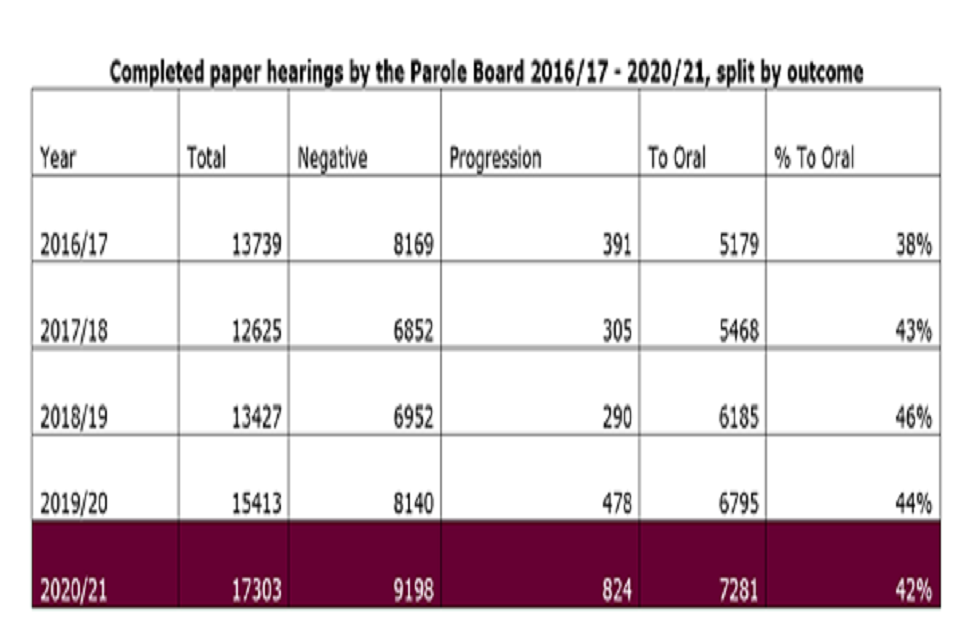 Completed paper hearings by the Parole Board 2016/17 – 2020/21, split by outcome