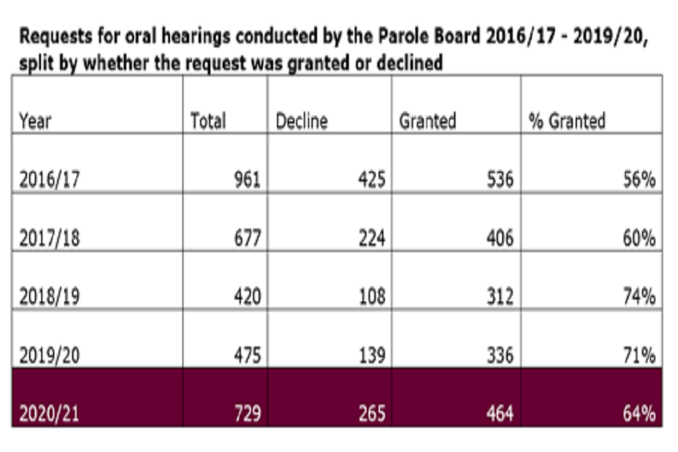 Requests for oral hearings conducted by the Parole Board from 2016/17 – 2020/21, split by sentence type, review type and outcome