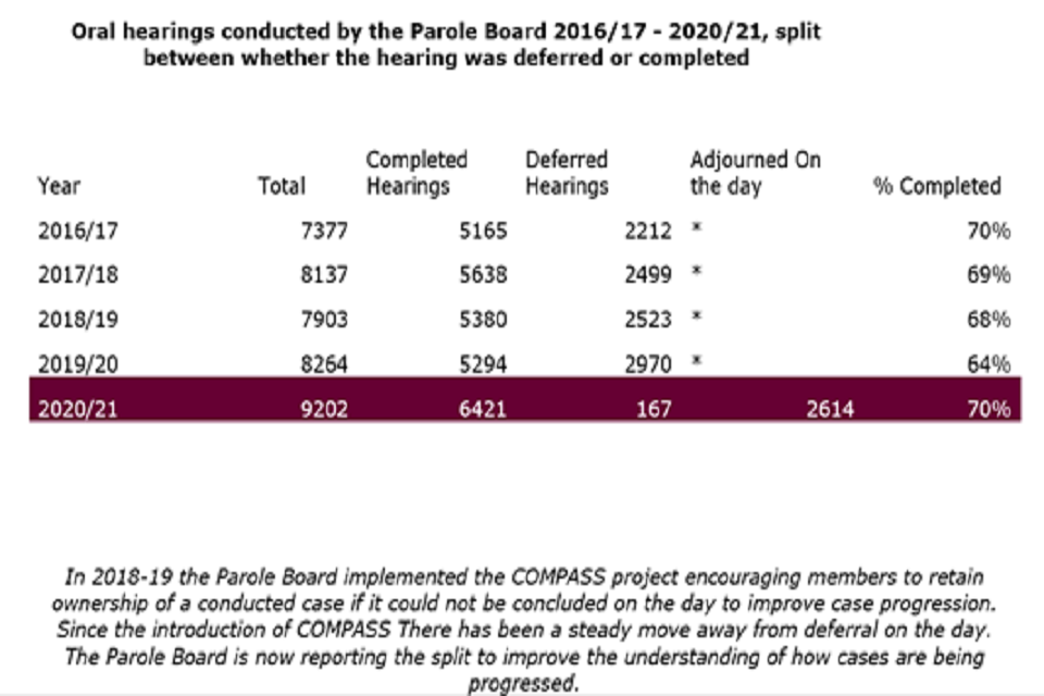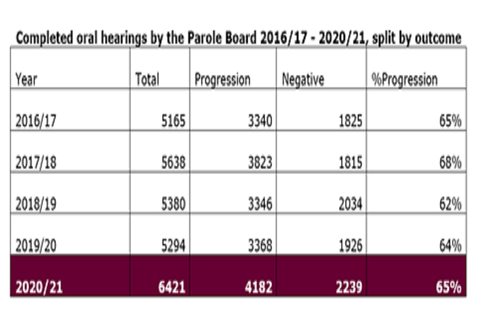 Completed oral hearings by the Parole Board 2016/17 – 2020/21, split by outcome
