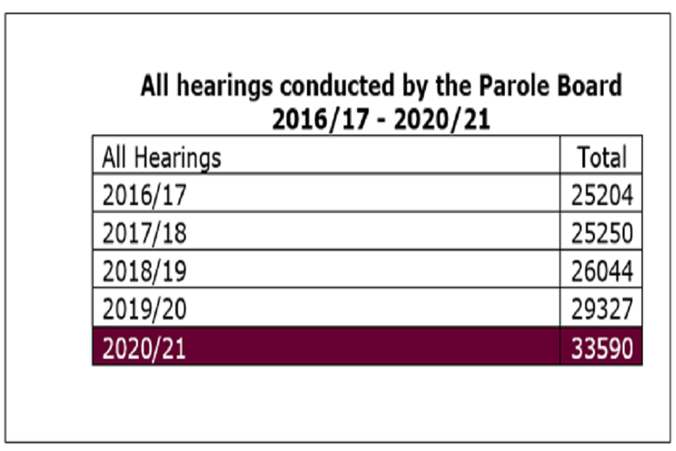 All hearings conducted by the Parole Board 2016/17 – 2020/21