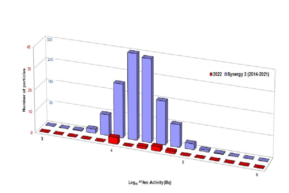 Figure 2: Radioactivity of finds classified as alpha-rich particles between May 2014 to December 2021 (termed “Synergy2” and shown in blue) compared to data from 2022 (termed “2022” and shown in red).