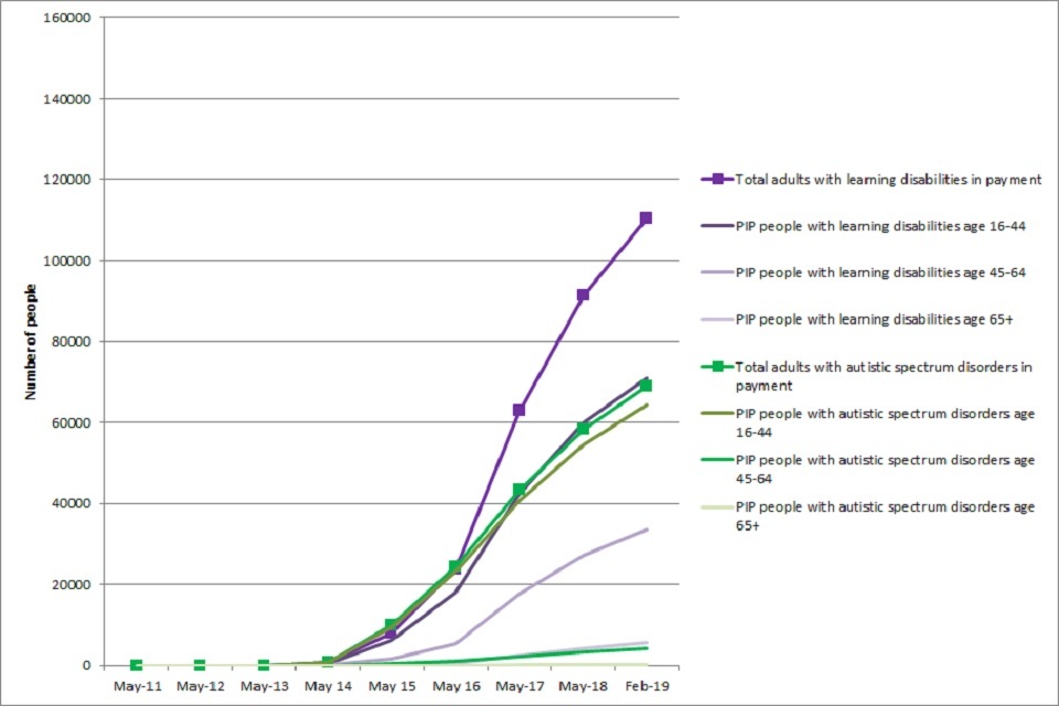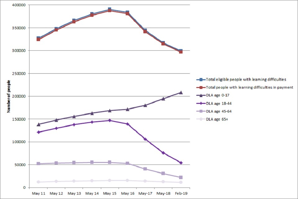 DWP data can be disaggregated using the category of ‘learning difficulties’ for Disability Living Allowance (DLA) and Attendance Allowance (AA), and the category of ‘learning disabilities’ for the Personal Independence Payment (PIP).