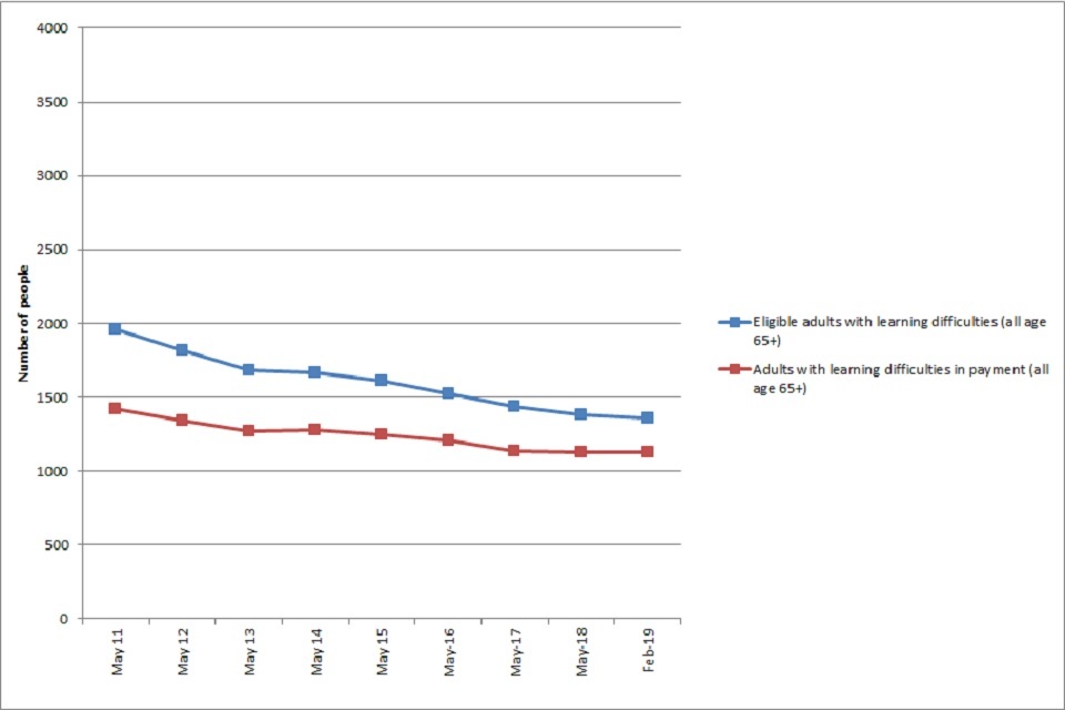In February 2019, a total of 1,127 adults aged 65 years or over, in the category of ‘learning difficulties’ (83% of those eligible for AA) received AA payments at an average £66.04 per person per week. The number of people with learning difficulties receiving AA has gradually reduced over time.