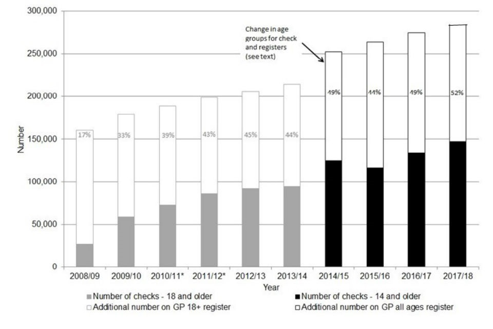 The number of checks reported and the number on the register both jumped upwards between 2013 to 2014 and 2014 to 2015. The number of checks reported fell in 2015 to 2016. This is probably not an accurate reflection of what happened. In 2014 to 2015 a new data collection system was introduced. That year a small number of areas reported more checks than people on the register.