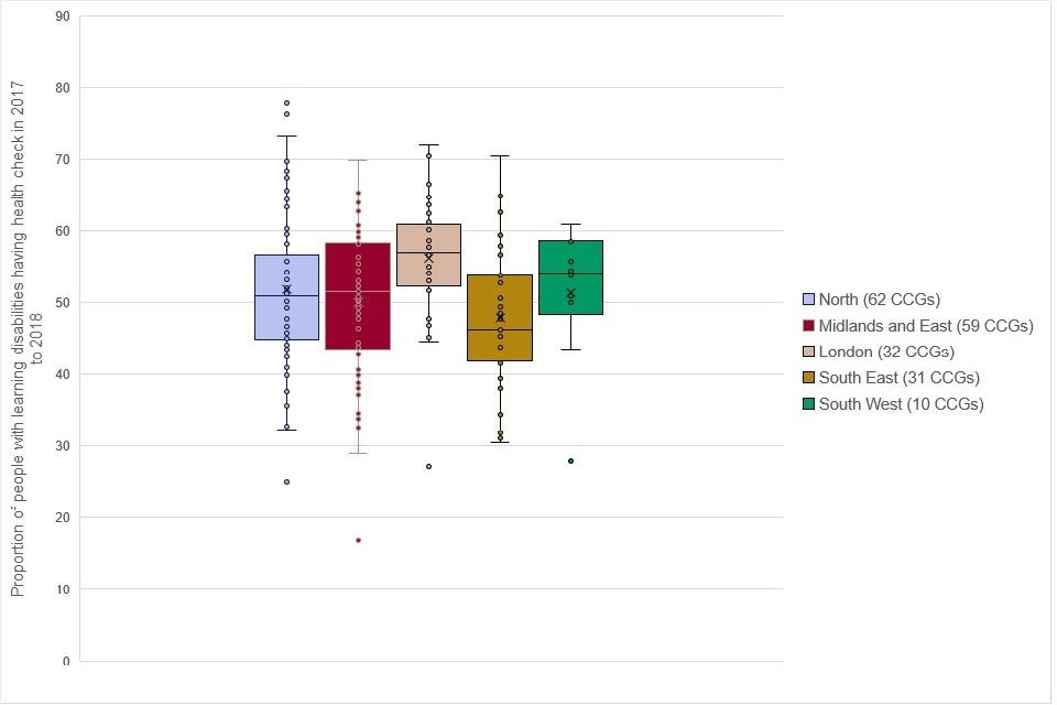 The coverage of the health check scheme varies considerably around the country. In 2018, the CCG with the highest coverage (Eastern Cheshire) reported checks being done on 78% of people on GP learning disability registers. One other CCG (Knowsley) achieved better than 75% coverage. At the other end of the scale, 26 CCGs achieved coverage of less than 40%, 5 of them less than 30%.