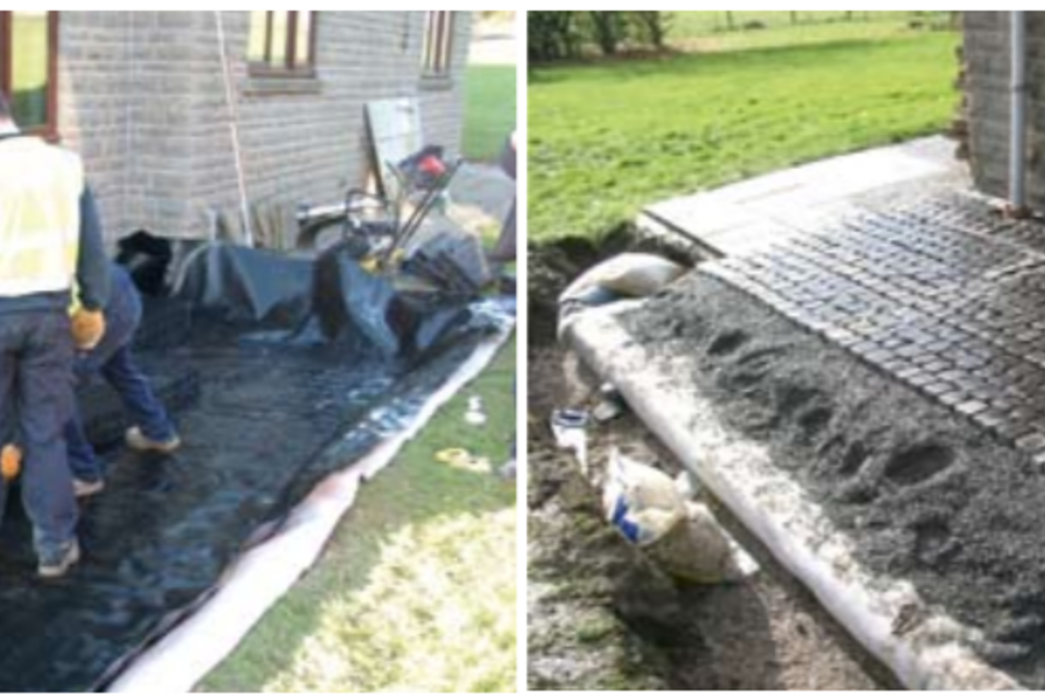 A bucket of water poured onto the permeable sub-base on the left will soak in straight away in a small area. It will take longer for water to soak into compacted impermeable hardcore or Type 1 and it will spread over a wider area.