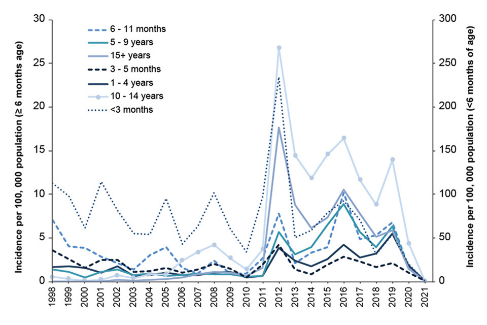 Figure 2. Incidence of laboratory confirmed pertussis cases by age group in England: 1998 to 2021