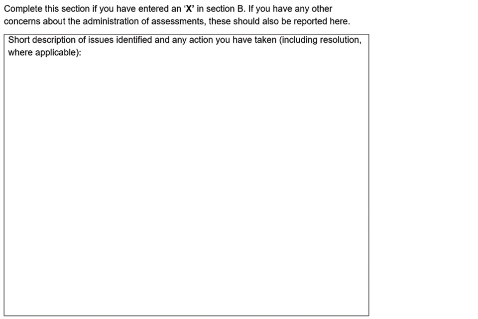 If you identify any irregularities during your visit that require an urgent response, discuss this with your monitoring visits co-ordinator so they can immediately email the completed form to sta.maladministration@education.gov.uk.