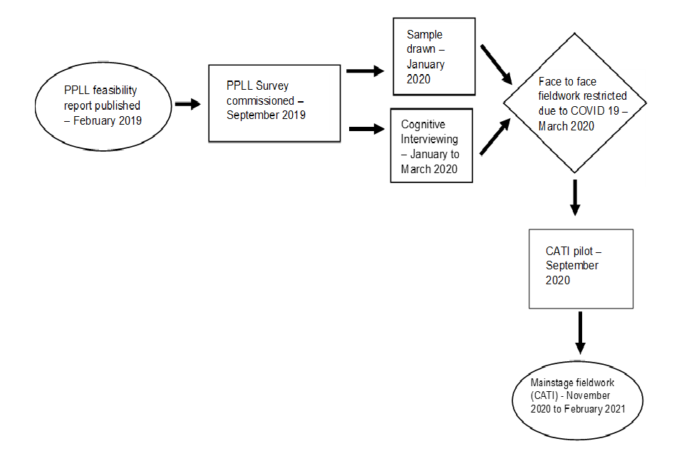 In line with the recommendations of the original Feasibility Report, PPLL was commissioned as a face to face survey. Face to face interviewing was considered the best way to maximise both response and data quality to a survey which would involve a fairly long interview (45 minutes) on topics that would not necessarily be particularly salient to the general public. Fieldwork was originally scheduled for June – October 2020.