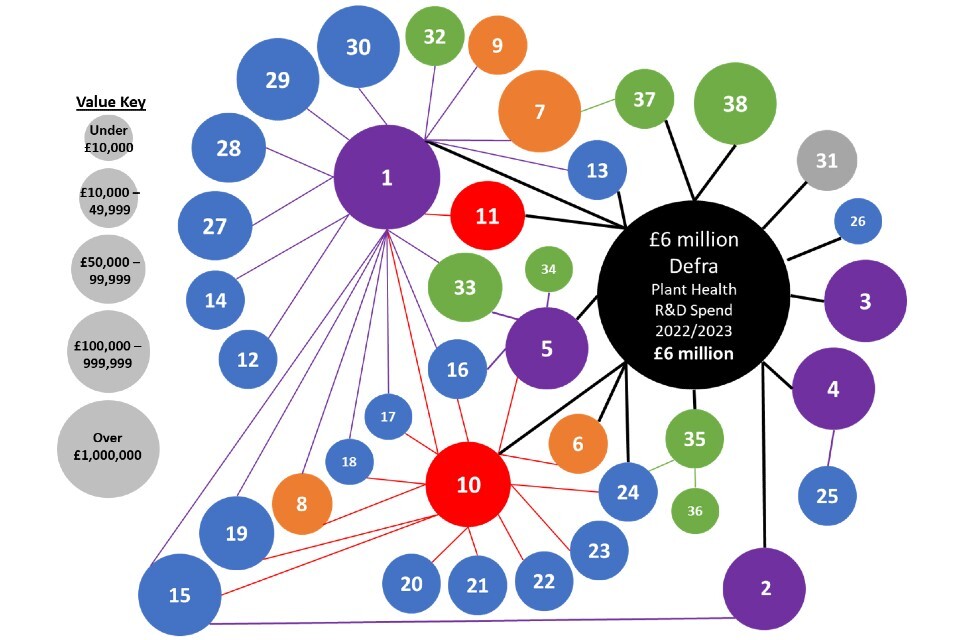 These lead research providers secured further research support from a much larger pool of research providers including universities, research organisations and non-governmental organisations as outlined in figure 1. Defra co-funded the Biological Sciences Research Council (BBSRC) Bacterial Plant Diseases Programme, helping to leverage approximately £13 million of UKRI funding towards plant health priorities. The programme distributes funds to organisations including the National Institute for Botany, Fera Science Ltd, James Hutton Institute, Forest Research, as well as multiple universities and further sub-contractors.