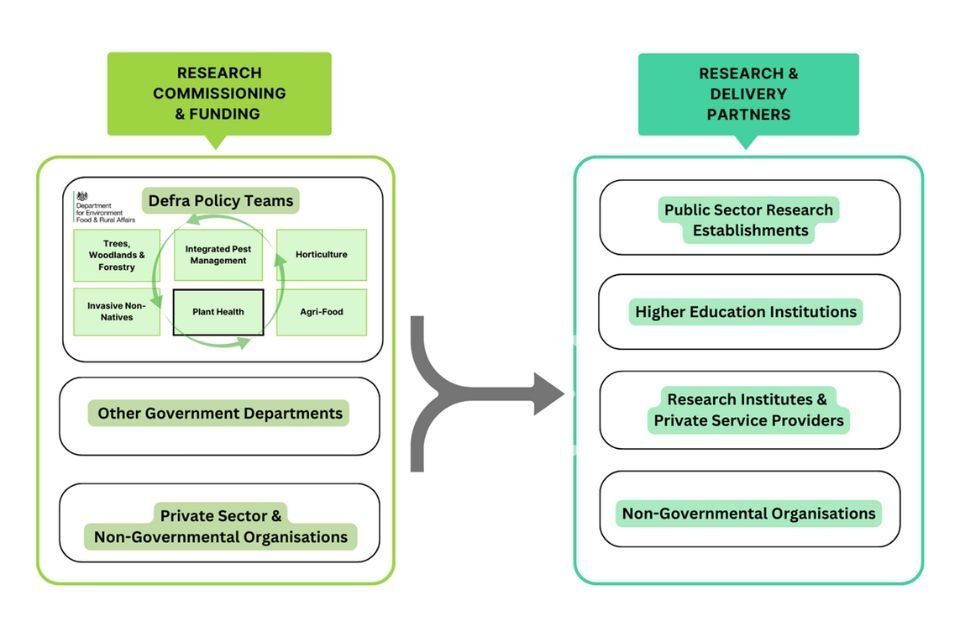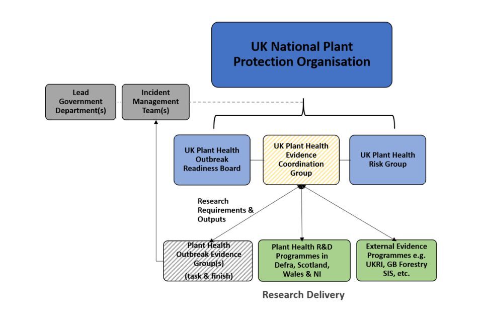 The UK Plant Health Service (PHS) is comprised of Defra, the Scottish Government, Welsh Government, Daera, and the Forestry Commission and supported by the Animal and Plant Health Agency (APHA). The work of the UK PHS is set out in the UK plant health: provisional common framework and overseen by the National Plant Protection Organisation (NPPO), and its subgroups, Plant Health Outbreak Readiness Board and Plant Health Risk Group. Meeting Defra’s research and development needs is critical to the effectiveness of these operational structures. Further detail on this process is provided in the following chapter.